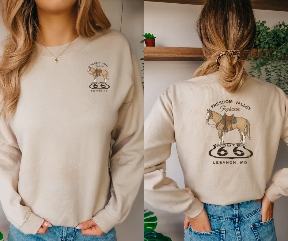 Introducing Freedom Valley Rescue’s Route 66 Design – Embrace your love for horses and support a worthy cause with this cozy sweatshirt, a must-have for all charitable fashionistas!